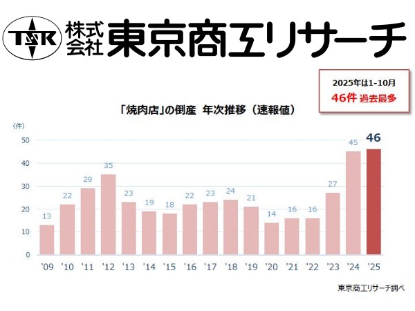 出所:東京商工リサーチ | 『2025年の「焼肉店」倒産 46件 年間最多を更新 値上げ・高級化で客離れ加速、低価格チェーンとの競争激化』より